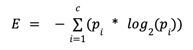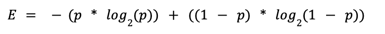 In the binary classification setting, where p is the probability of belonging to one class, Entropy is calculated by using the following formula:
