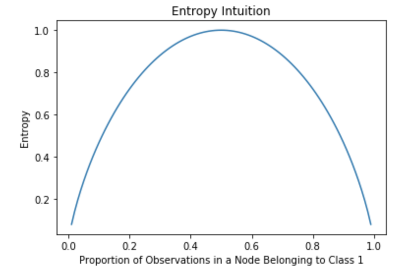 The intuition can be presented by considering how entropy changes as a result of the above formula when the proportion of observations in a node that belong to 1 class changes across the possible range of proportions. In the extreme cases, where almost all observations belong to one of the classes, the entropy is very low, indicating greater homogeneity of that node. When the class distribution approaches 50/50, the entropy is at its peak of 1, which happens as a result of using log base 2 in the formula.