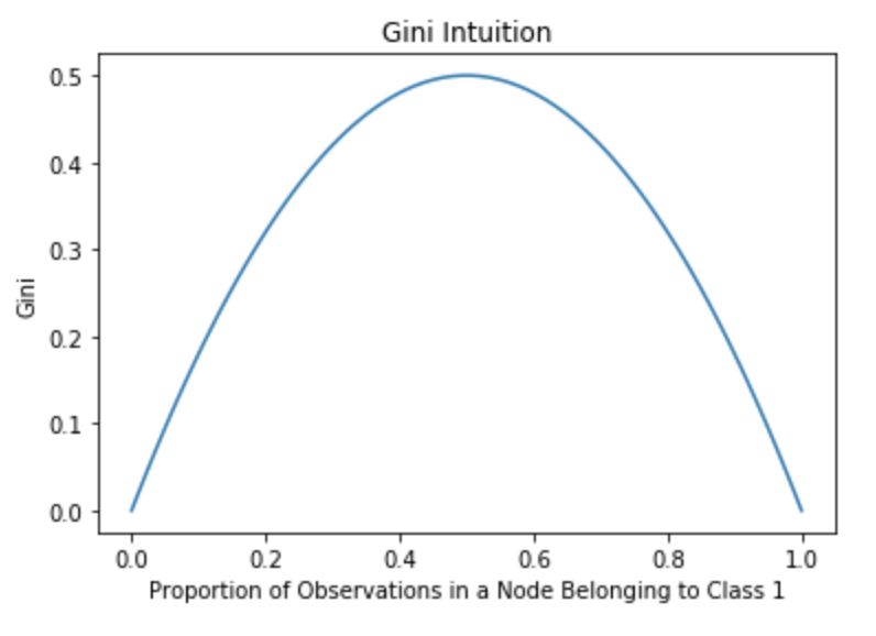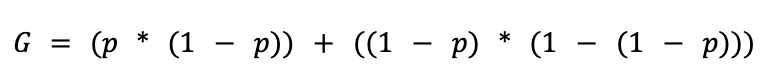 A similar approach can be taken to understand the Gini calculation, which in the binary classification case, is formulated by: