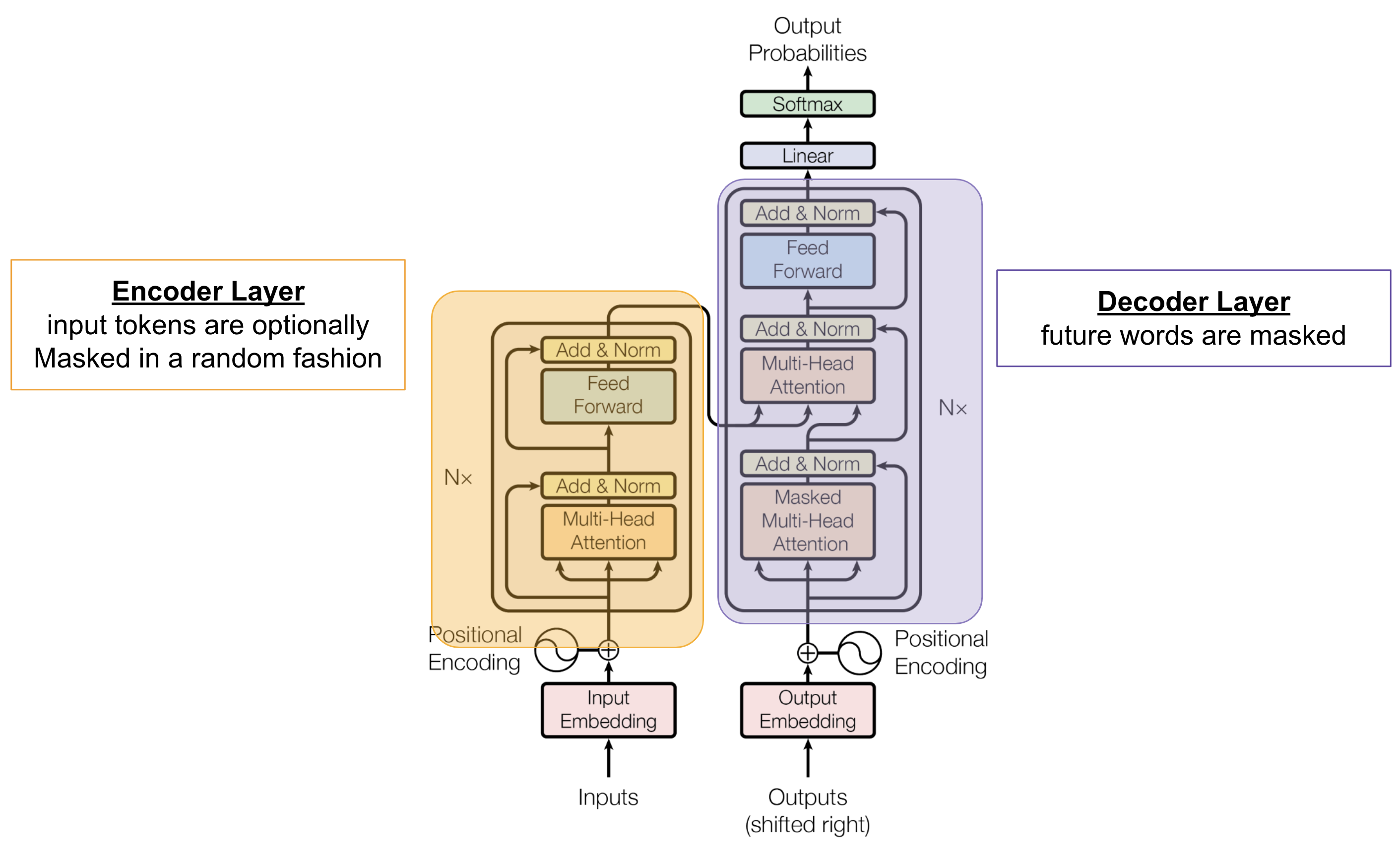 – The encoder and decoder each have their own stacks of layers, and the decoder additionally employs masked self-attention to ensure that each position only looks at previous positions during generation.