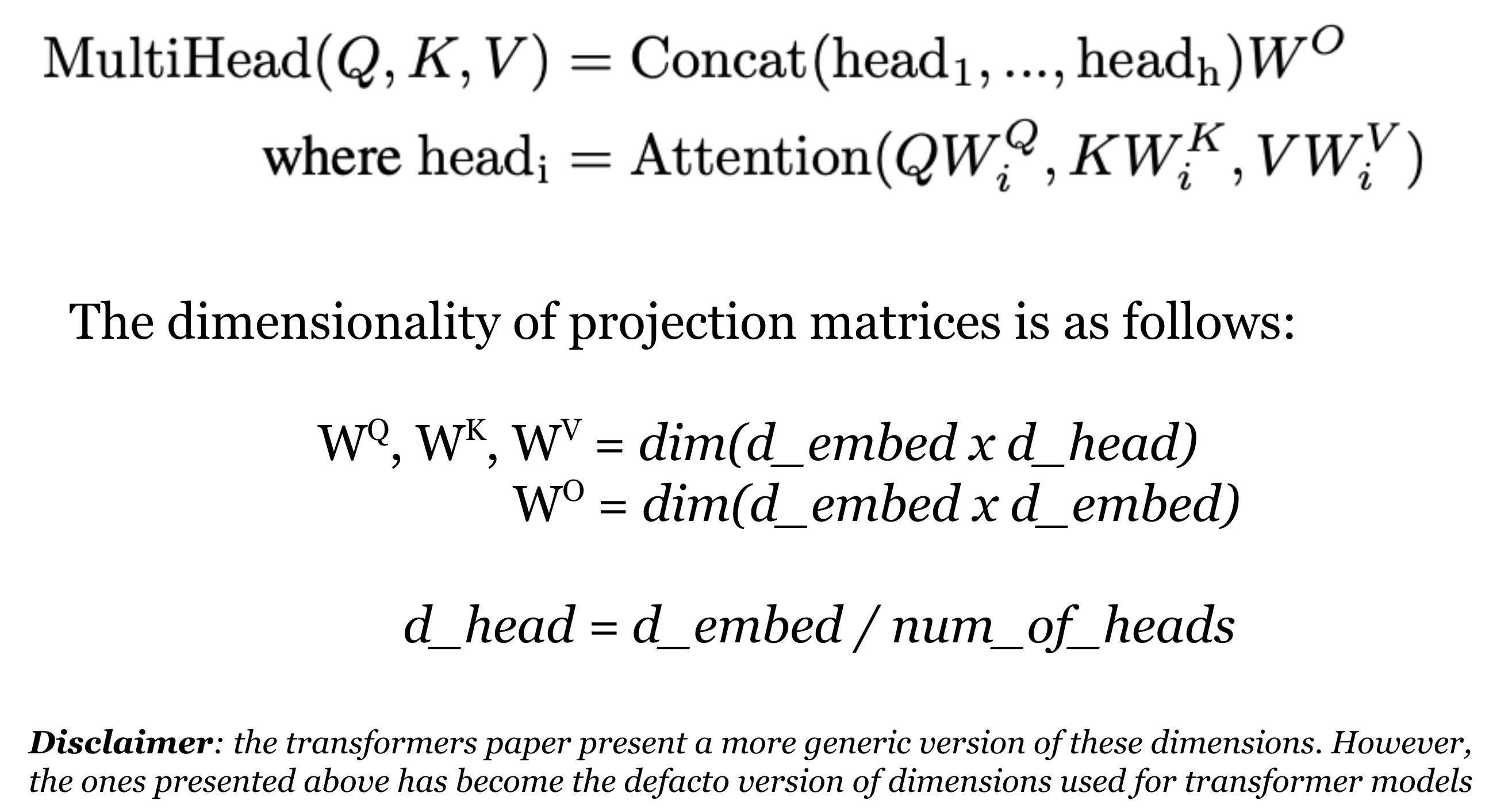 – Head_size for each head is computed as d_embed / num_of_heads. Thereafter, output from each head is concatenated to generate an attention vector of dimension d_embed. This vector is then passed through another projection matrix of dimension (d_embed x d_embed) to generate the final multi-head attention vector as explained below: