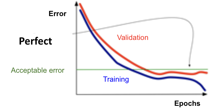 A learning curve is a diagnostic tool that plots the error metric used to evaluate a machine learning algorithm for both the training and validation data at each iteration of the algorithm. In most cases, the training error, or deviance, will continue to decrease as the model is built out, while the validation error decreases for a number of iterations before eventually increasing. The point at which the validation error first begins to rise provides guidance for an appropriate number of iterations to balance the bias/variance tradeoff. A classic learning curve is drawn below, with the optimal stopping point marked.