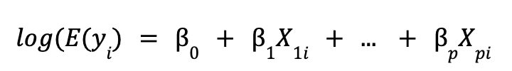 Poisson regression is used when it is believed that the target variable is generated from an underlying Poisson distribution, which occurs in cases where the data is measured in counts. The Poisson is a discrete distribution used to model the average number of occurrences of an event over a specified time frame, such as the number of customers that enter a store each hour of the day. As count data cannot be less than zero, GLM uses a log-link function to constrain predictions to be non-negative through the following formulation: