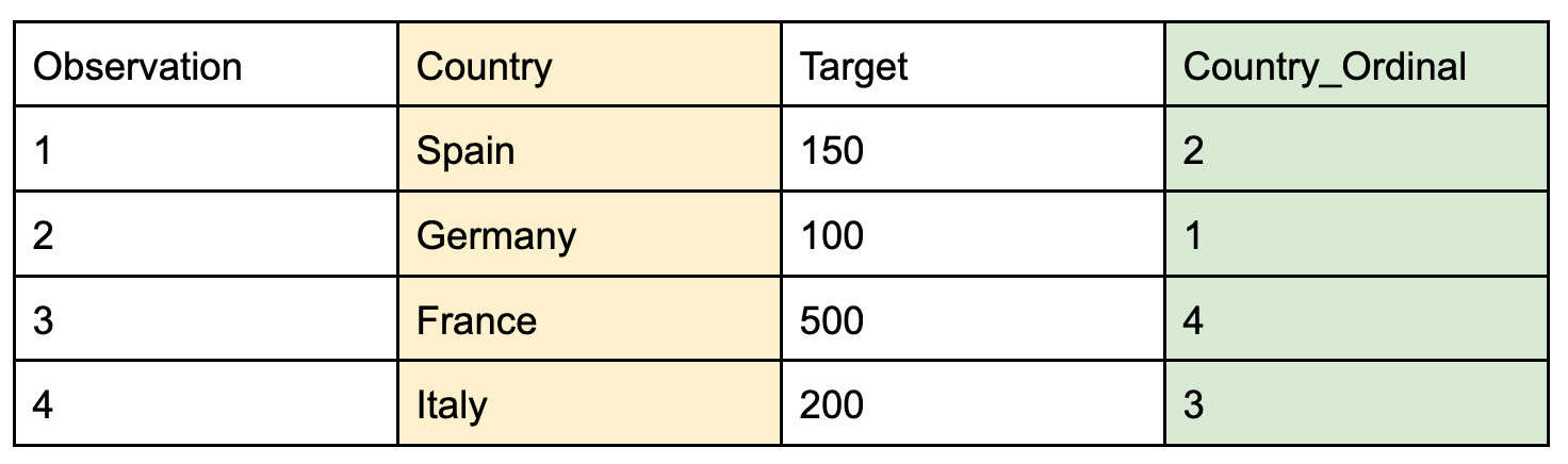 - Ordinal Encoding: This is another way to convert a categorical variable into a numeric representation suitable for model training. Unlike dummy encoding, ordinal encoding requires knowledge of the target values corresponding to each observation. It works by sorting the original data in ascending order by the values of the target and then replacing the raw values with the index of the sorted data. An advantage of ordinal encoding is that it creates a monotonic relationship between the transformed input variable and target, which is beneficial for some algorithms. It is important to obtain the mapping from the original to transformed version of the variable using only the training data to avoid information from the test set leaking into the training process and possibly inducing bias.