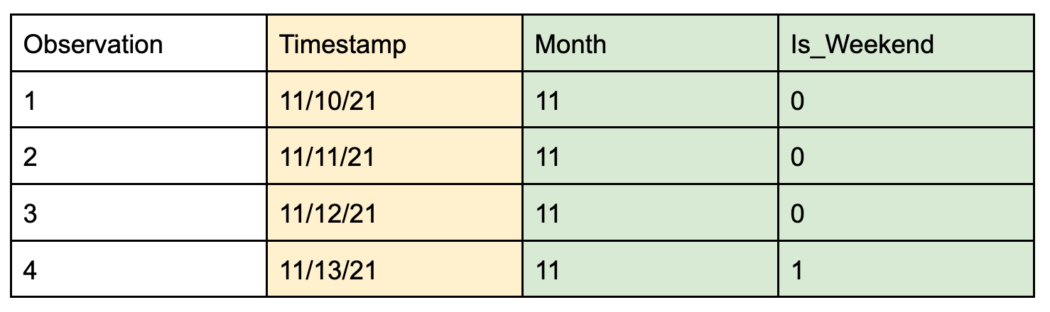 - Date Extraction: Timestamp attributes can be very informative for certain forecasting applications. A common feature engineering technique that allows one to utilize information from these types of features is to extract components from a timestamp, such as the year, month, day, or hour. More complicated dimensions such as whether the day is a weekend, holiday, or business day can also be highly predictive in certain contexts, such as sales.