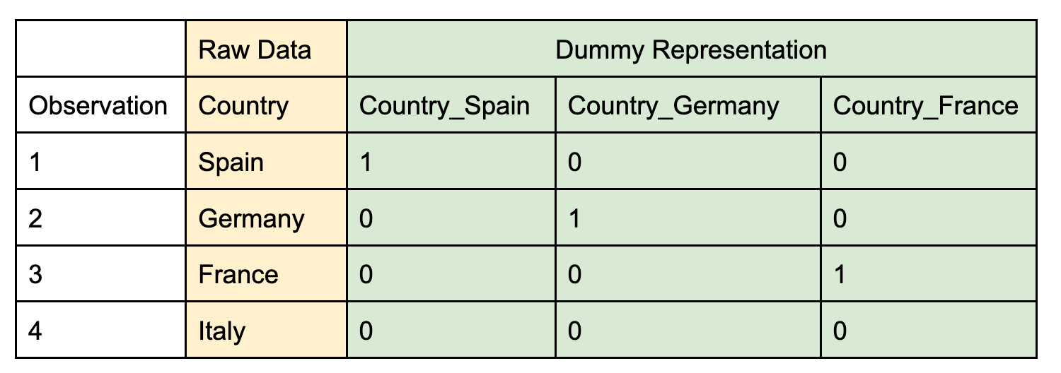 - Dummy encoding: In order to represent a categorical variable in a machine learning model, it usually must be somehow coded numerically before it is used in the training of a model. The easiest way to do so is to create a series of dummy variables (k-1 dummies for a variable with k distinct categories) that take on a value of 1 when the original field is equal to the kth category and 0 otherwise. As one level can be represented when all of the dummy variables are set to 0, there should be one less dummy variable compared to the total number of unique categories of the variable to avoid redundancy. An illustration of dummy variable transformation is shown below, assuming the four categories for country are the only unique values present in the dataset.