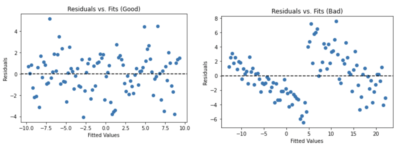 This assumption can be checked by plotting the fitted values of the regression on the X-axis against the residuals of the model on the Y-axis. Any discernible pattern on the residuals vs. fits plot could indicate a violation, and common patterns include fanning out, where the variance increases as the fitted values get larger, or caving in, where the variance is high for both large and small fitted values but smallest in the middle. Below is an example of a properly-looking Residuals vs. Fits plot (left) as well as one that might indicate heteroskedasticity, or non-constant variance (right).
