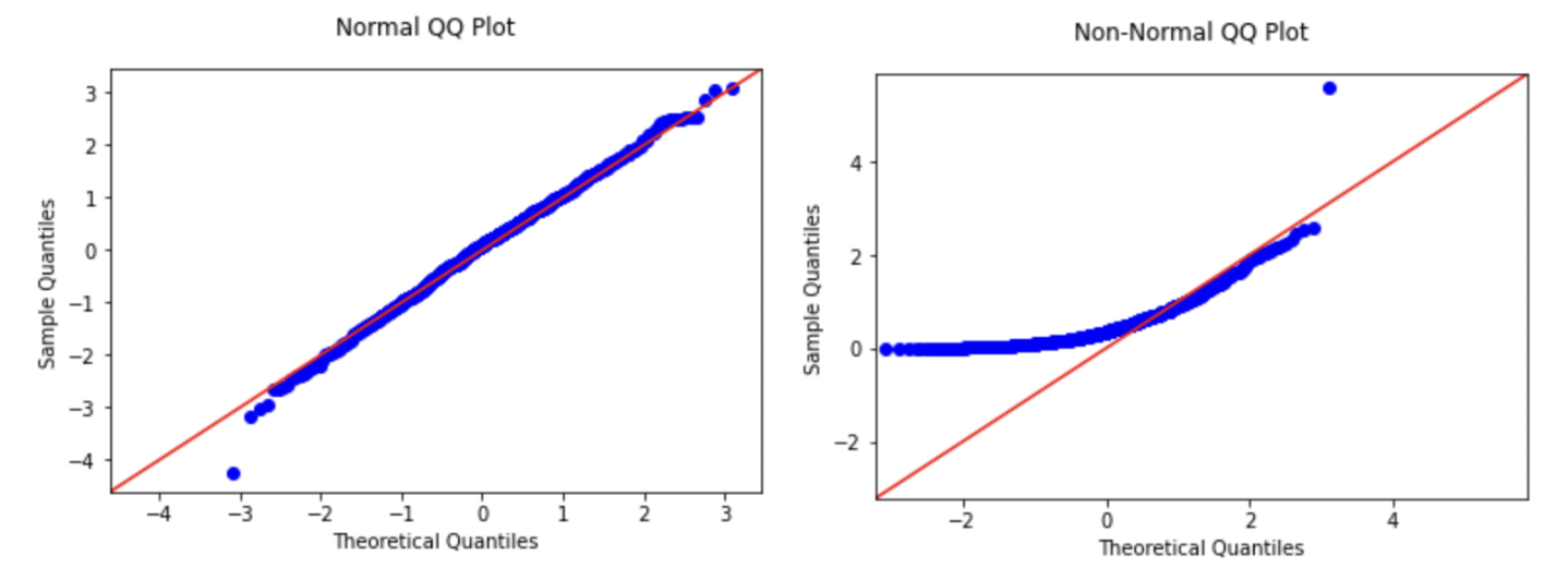 Alternatively, this assumption can be verified using a QQ-plot, on which the points should fall close to the 45-degree line passing through the origin. If the points deviate from that line or follow a different pattern from a straight line, it might indicate a violation of the normality assumption. The first plot below shows an example of data that likely satisfies the normality, where the second would indicate a likely violation.