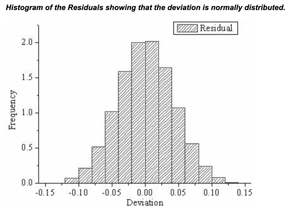This assumption implies that the errors are identically distributed instances taken from a normal distribution centered at 0. If the residuals were plotted on a histogram, they should follow a bell-shaped curve that peaks at 0 with few observations in the far tails of the distribution as shown below.
