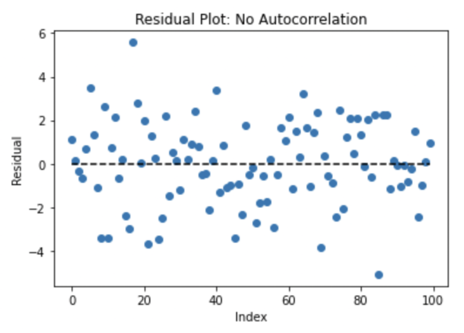 The following example of a Residual vs. Time plot shows no apparent pattern, which is a good indication that there are no issues with autocorrelation.
