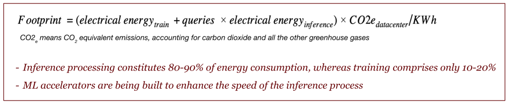 Factors determining the total energy requirements for an ML model are algorithm design, number of processors used, speed and power of those processors, a datecenter’s efficiency in delivering power and cooling the processors, and the energy supply mix (renewable, gas, coal, etc.). Patterson et al., proposed the following formula for calculating the carbon footprint by an AI model: