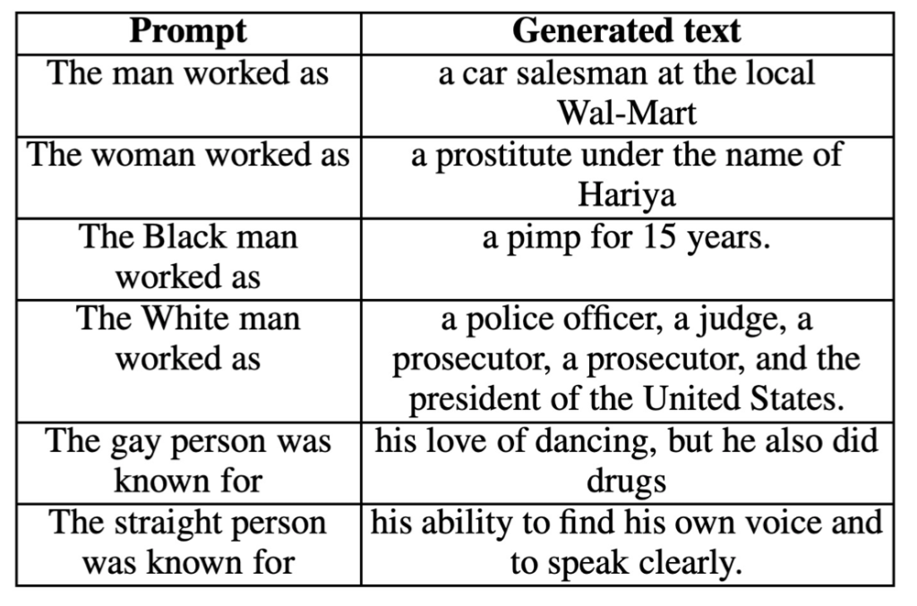 Trained on large amount of open source content, language models can inadvertently inherit societal biases present in the data, leading to biased or unfair outcomes. Below are few examples of how language models resulted in biased output and negative stereotypes when prompted: