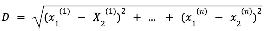 The Euclidean Distance, or L2 norm, is the most common distance metric used in clustering. It measures the straight-line, or shortest, distance between observations in p-dimensional space. In two dimensions, the formula reduces to the commonly used Pythagorean theorem. For two observations x1 and x2, the Euclidean Distance is computed by the following, where the superscript denotes the dimension from 1 to n: