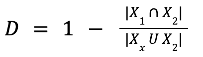 The Jaccard Index measures similarity for two sets of data by computing the ratio of items present in both sets (the intersection) to the total number of distinct items present in either set (the union). As a larger Jaccard Index indicates more similar sets, it can be converted to a distance metric by subtracting the index from 1. It is also a measure that is commonly used in measuring text similarity, as documents can be decomposed into sets based on the words they contain. For two sets X1 and X2, the Jaccard Distance is given by
