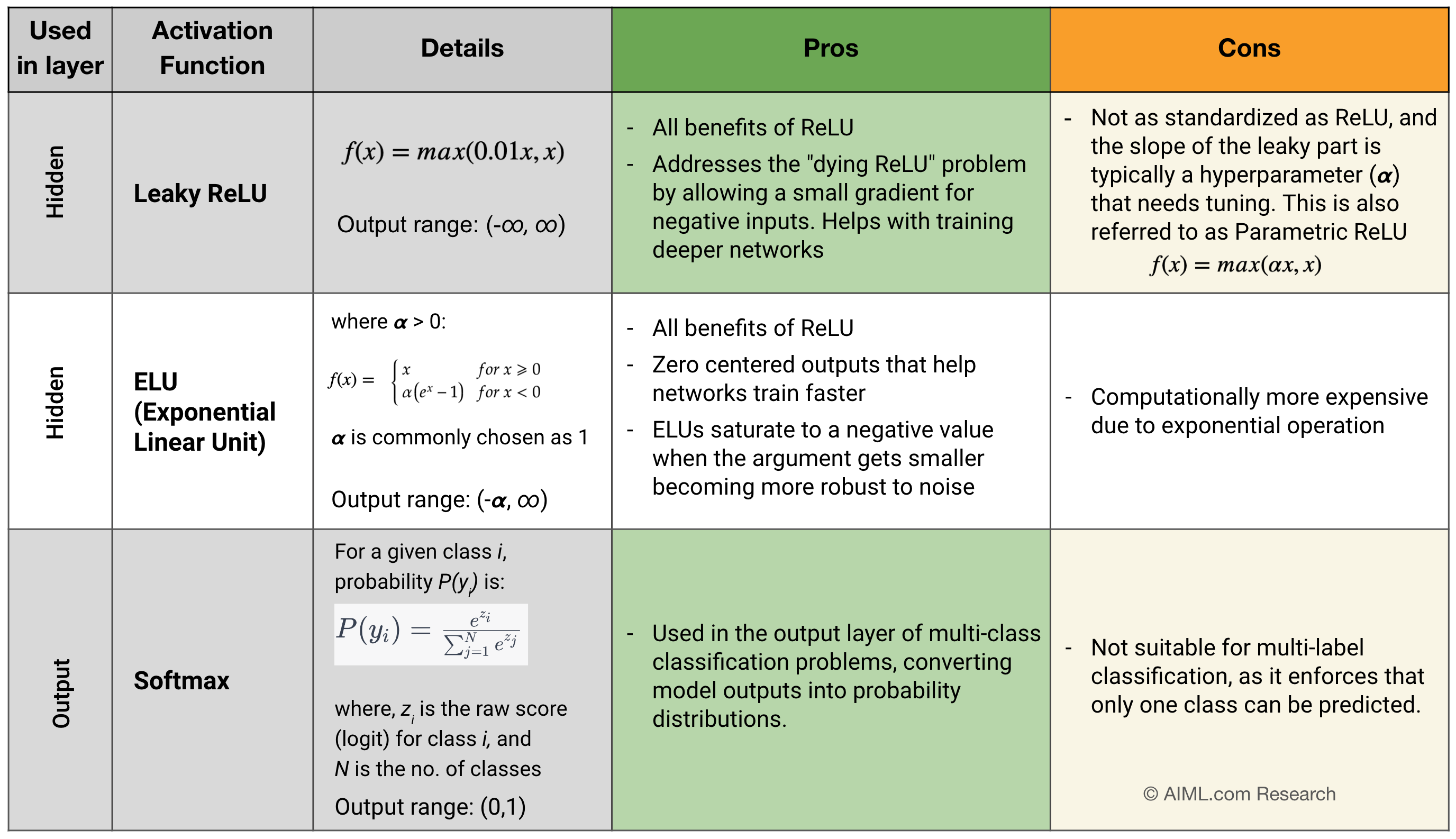 • Leaky ReLU: Leaky ReLU addresses the “dead neurons” / “vanishing gradient” problem by allowing a small gradient for negative inputs. It has the form: