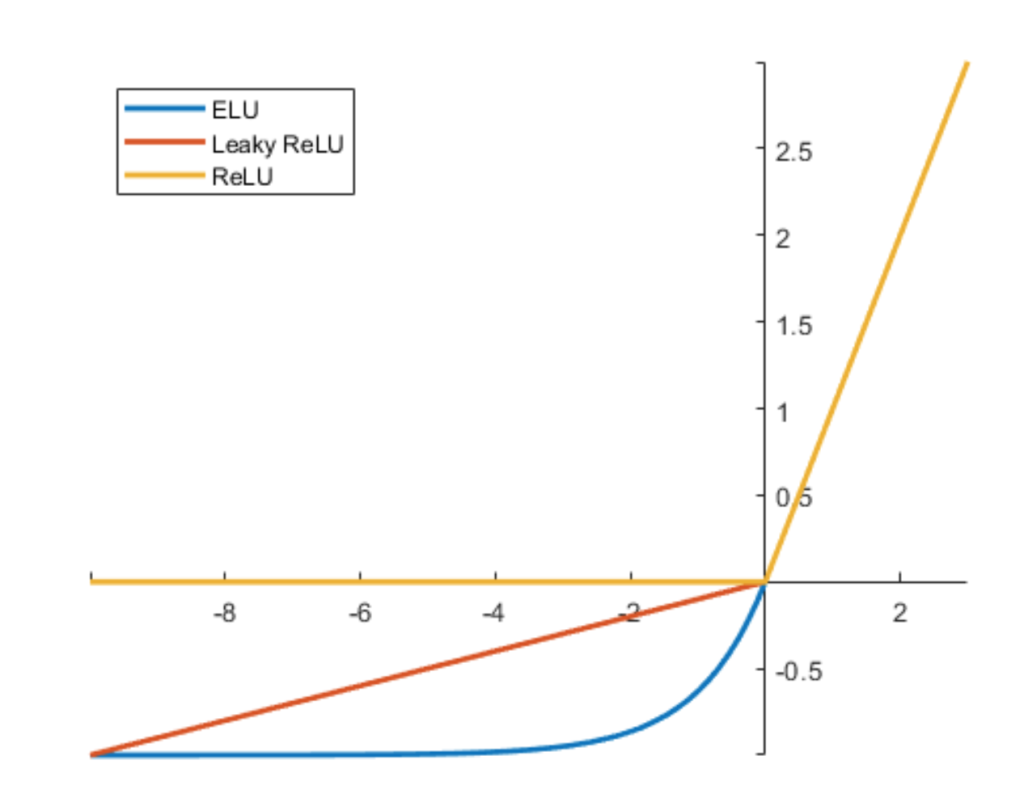 • Exponential Linear Unit (ELU): ELU is another variant that smoothens the transition for negative inputs to avoid dead neurons. It has the following form:
