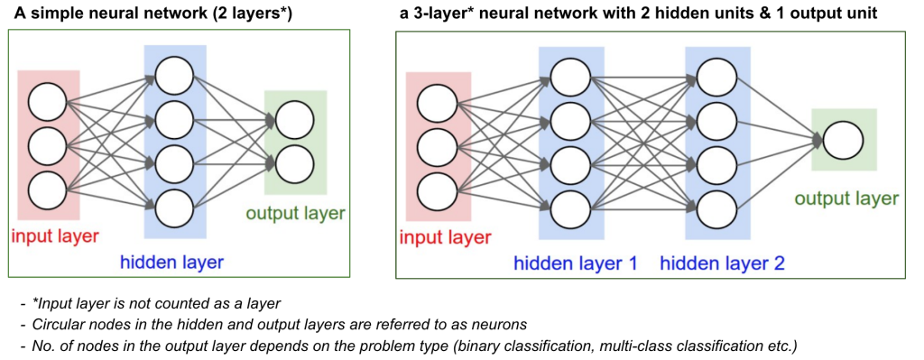 • Hidden layers are intermediate layers between the input and output layers. They perform computations on the input data through weighted connections between neurons and transformed using an activation function. The hidden layers, in essence, are responsible for extracting features and patterns from the data.