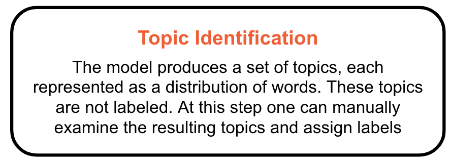 It assume that some number of “topics,” which are distributions over words, exist for the whole collection (far left). To identify topic distribution of each document, first choose a distribution over the topics (the histogram at right); then, for each word, choose a topic assignment (the colored coins) using statistical analysis